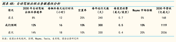 我们假设自动驾驶出租车均为电动车,渗透率增速与电动车相近,根据UBS预测,将于2030年达12%;每辆车每天运行16小时,每年运行300天;根据麦肯锡预测,自动驾驶出租空置率可缩小至15%;2030年Waymo占自动驾驶出租市场份额可达15%,定价可降至0.5美元/英里。