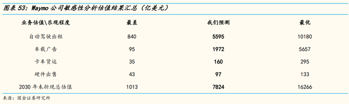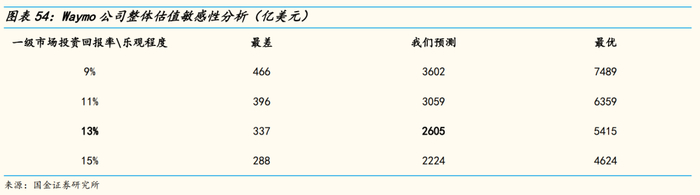 结合此前的敏感性分析结果,我们汇总了四种业务发展不同乐观程度及采用不同一级市场投资回报率进行折现的估值结果。根据我们预测的情况可知,当取一级市场投资回报率为15%、业务发展情况最差时,我们得出Waymo的最低估值为288亿美元;当取一级市场投资回报率为9%、业务发展情况最好时,我们得出Waymo的最高估值为7489亿美元。在我们预测的情况下采用13%的一级市场投资回报率进行贴现,Waymo2020年总估值超2600亿美金。