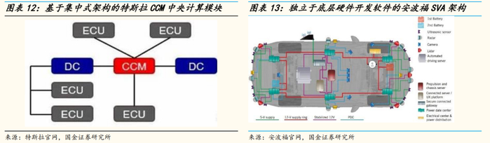 现有三种软硬件解耦的模式,分别是基于分布式架构的AUTOSAR规范、基于集中式架构的特斯拉CCM中央计算模块与完全独立于底层硬件开发软件的安波福SVA架构。1)基于集中式架构的特斯拉CCM中央计算模块