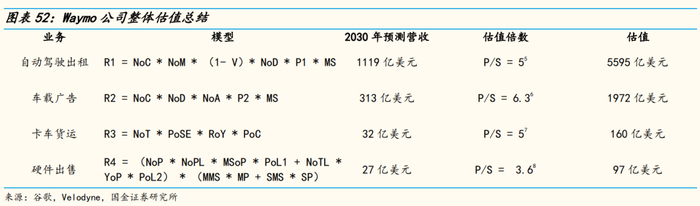 对于车载广告业务,我们认为Waymo将继承母公司运营广告、娱乐业务的作风,参考谷歌估值,取P/S = 6.3。