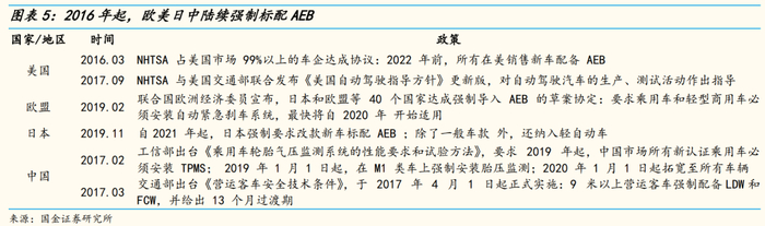 政策规定推动ADAS普及。各国自 2014 年起陆续将AEB 纳入汽车产品考核评分列表中,无AEB 车型不能获得最高评价。2016年起,欧美日中陆续强制标配 AEB。