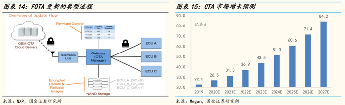 加速自动驾驶级别迭代,OTA升级极大改善用户体验。OTA (Over the Air) 是指通过网络连接实现终端内存储数据的更新,进而改善终端的功能和服务的技术。汽车 OTA 主要分为 FOTA(Firmware-over-the-air,固件在线升级)和 SOTA(Software-over-the-air,软件在线升级)两类,分别指完整的系统性更新与迭代更新的升级。通过OTA升级不仅可以减少召回成本、便捷修复软件缺陷,还能缩短上市周期、提高用户粘性、促进双向交流。据Megan,OTA升级市场预计2019年到2027年复合增长率为17.94%,将从22.5亿美元增至84.2亿美元。