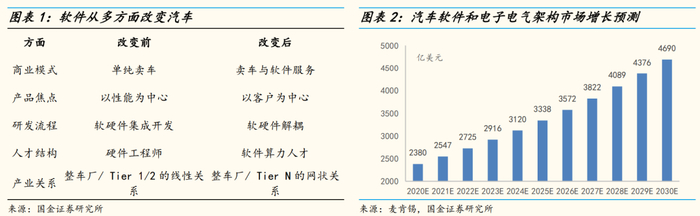 需求侧-从单一出行工具转变为具有强烈个人属性的生活第三空间,消费 者对汽车认知的发展导致汽车代码及计算量激增;供给端-整车 ECU 冗余, 分布式架构造成大量算力浪费,框架无法复用,硬件无法升级,OTA 无法 统一,不能满足现阶段汽车发展需求。据麦肯锡《汽车软件与电子 2030》, 汽车软件在乘用车的整车价值中占比预计 2020 年到 2030 年复合增长率为 11%,将从 10%增至 30%;汽车软件和电子电气架构市场预计 2020 年到 2030 年复合增长率为 7%,将从 2380 亿美元增至 4690 亿美元。