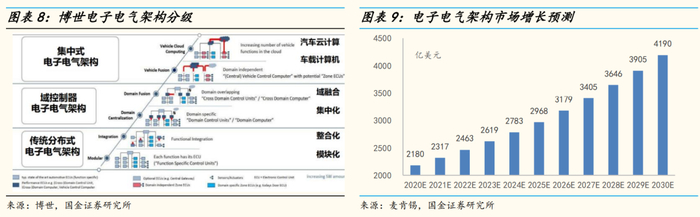 在自动驾驶赛道,感知层众多传感器带来的大量数据亟需高算力芯片、可复用框架及可统一OTA支持,集中式电子电气架构转型需求强烈。据麦肯锡《汽车软件与电子2030》,电子电气架构市场预计2020年到2030年复合增长率为7%,将从2180亿美元增至4190亿美元。
