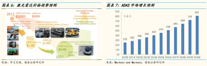 激光雷达有望通过规模量产+技术进步快速降价,其中自动驾驶领域机械式激光雷达占主导,固态式份额逐渐增多。据Yole Development,预计2025 年固态式出货量约为 5 万个,单价降至1460美元,销量占比为4%,机械式约120 万个,单价降至3800美元;2030 年固态式出货量约 54 万个,单价降至1200美元,销量占比12%,机械式约 400 万个,单价降至1500美元。
