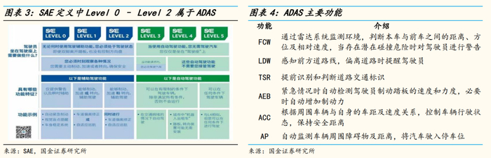 根据SAE对于自动驾驶等级的划分,Level 0 – Level 2 均属于ADAS的范畴。主要功能包括FCW前方碰撞预警、LDW车道偏离警示、TSR交通标识识别、AEB自动紧急制动、ACC自适应巡航、AP自动泊车等。