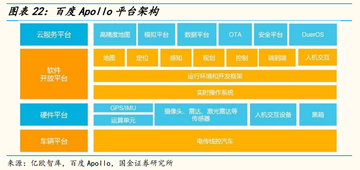 与Waymo不同,早期百度就明晰了车企乙方的自我定位。由于硬件能力的缺失,百度创建了Apollo平台,提供地图定位、软件算法及云计算等软件服务,希望通过开源的标准降低自动驾驶门槛,吸引负责硬件、集成及整车生产的硬件供应商,为整车厂联合提供服务。2017年7月,德赛西威、禾赛科技、联创电子、地平线、大陆、博世等供应商及奇瑞、一汽、长安、长城、蔚来等15家车企成为首批合作伙伴。