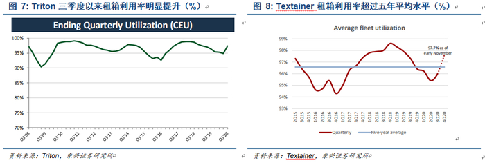 为应对上半年贸易量的减少,航运公司普遍在在2020年上半年减少了船舶运力,主要航运公司从去年上半年开始提高了盈利能力。由于贸易量反弹、高运价和低燃料成本,2020年下半年开始航运公司业绩将非常强劲。全球集装箱保有量目前有约4400万TEU,其中航运公司拥有集装箱2300万TEU,占比为52%,剩余份额基本为租箱公司占据。从租箱利用率来看,三季度Triton集装箱利用率达到97.6%,Textainer截止11月的利用率达到97.7%,CAI租箱利用率三季度末高达98.9%,且各家租箱公司均预期四季度租箱利用率将继续攀升。