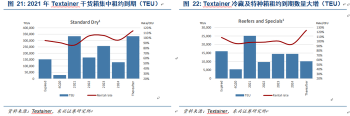 从需求侧来看,受贸易量激增和物流效率降低影响,集装箱需求仍将持续,尤其是亚洲到欧洲和美洲的航线。由于目前的租赁合约收益增长,且出租率较高,租箱公司购置集装箱的意愿大增。