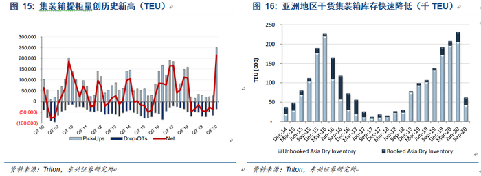 集装箱的需求与全球贸易和GDP增速有很大关系,2020上半年受疫情影响,全球贸易量出现暂时下降,但随着主要经济体贸易的恢复,以及消费者支出从旅行和服务转向商品消费,下半年集装箱需求激增。三季度以来,集装箱提柜量激增,亚洲地区干货集装箱库存快速降低。
