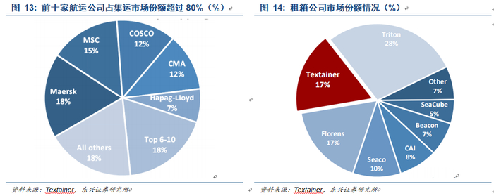 集装箱运输的参与者主要有实际承运人(轮船公司、铁路公司、公路运输企业、航空集装箱运输公司等)、集装箱租赁公司、集装箱船舶租赁公司、集装箱码头经营者、集装箱货运代理人、集装箱货运站等。2008年以来,集装箱租赁公司在集装箱运营中占比不断提升。目前集运市场和租箱行业格局总体较为稳定,行业集中度较高。目前全球前十大航运企业占据集运市场82%的市场份额,头部企业包括马士基(Maersk)、地中海航运(MSC)、中远集团(COSCO)、法国达飞海运(CMA)等。Triton(28%)、Textainer(17%)、Florens(17%)、Seaco(10%)、CAI(8%)在集装箱租赁市场占据前五的份额,前7家租箱公司占据集装箱租赁市场的93%。全球集装箱生产端,中集集团(CIMC,市占率约44%)、中远集团旗下上海寰宇(DFIC,市占率约24%)、新华昌(CXIC,市占率约13%)、胜狮货柜(Singamas,市占率约3%)占据绝大部分市场份额。