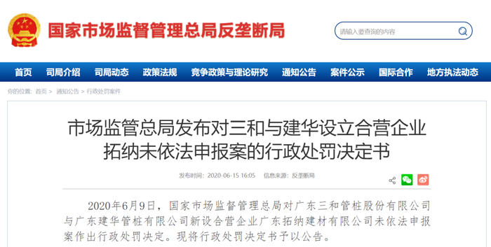 2020年6月9日,国家市场监督管理总局反垄断局对三和管桩与广东建华设立合营企业未依法申报案作出行政处罚。行政处罚决定书显示,三和管桩与广东建华新设合营企业,取得共同控制权,但未在合营企业取得营业执照前向反垄断局申报,构成未依法申报的经营者集中。