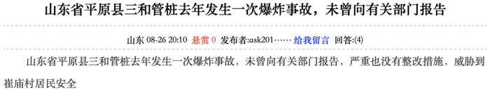 无独有偶,在110法律咨询网上,有群众2017年8月曾举报称,“山东省平原县三和管桩去年发生一次爆炸事故,未曾向有关部门报告,也没有整改措施,威胁到崔庙村居民安全”。从地址来看,被举报的公司可能是三和管桩子公司德州三和管桩有限公司,就位于山东省平原县三唐乡崔家庙村千佛塔北路。发生爆炸事故已经说明公司安全管理存在漏洞,对事故隐瞒不报更是严重的违法违规行为,而且对事故原因不进行整改也意味着安全隐患持续存在。若此项群众举报属实,那么三和管桩在安全生产方面信息披露的疑问又加深一层。