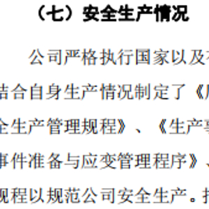 据招股书披露,“公司严格执行国家以及有关部委颁布的与安全生产有关的各种规章制度,并结合自身生产情况制定了《厂区消防管理规程》、《厂区安全管理规程》等安全管理规定及操作规程以规范公司安全生产。报告期内公司未发生重大的安全事故,未受到安全生产方面的重大处罚。”