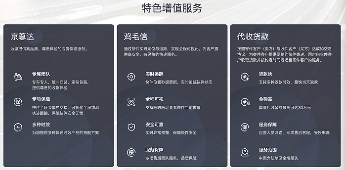 在京东快递提供的特色增值服务中,除了京尊达之外,还有全程可视化的“鸡毛信”服务,以及代收货款服务。
