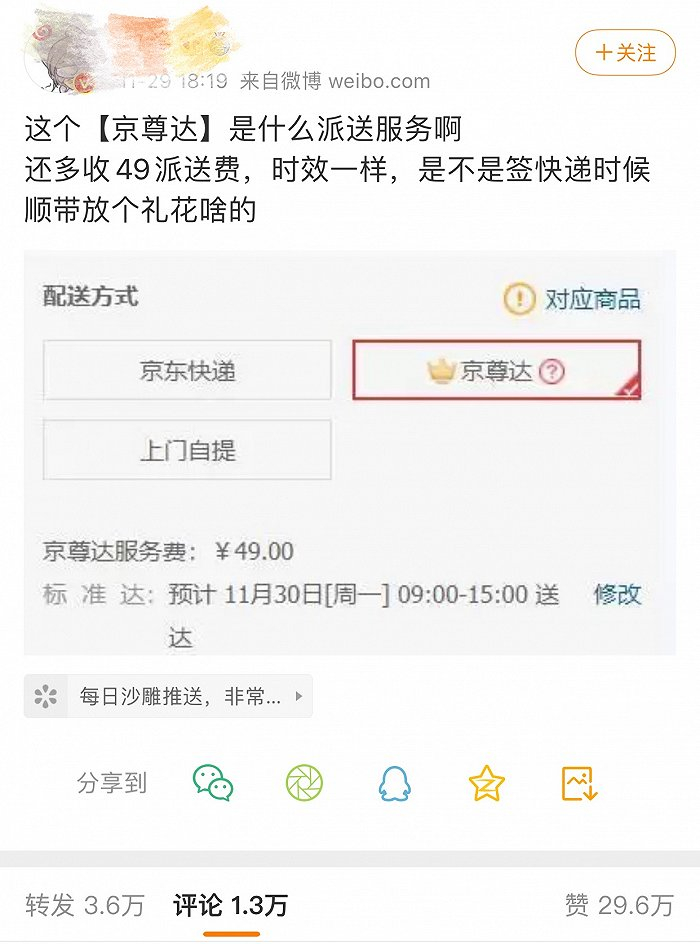 起因是一位微博网友发文询问,京尊达是什么派送服务,时效一样的情况下,还要多收49元派送费。