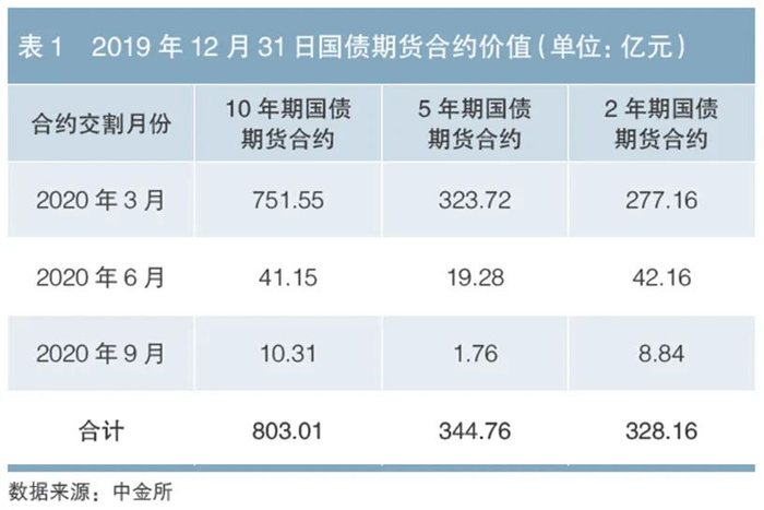 国债期货自2013年上市交易以来,规模增长较快。如表1所示,2019年末国债期货合约价值总计1475.93亿元,是2013年末36.32亿元的40.64倍。不过,与现券市场国债规模相比,国债期货市场存量还是很小。