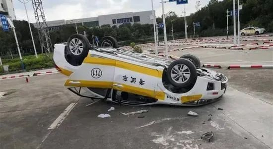 2018年9月25日,广东珠海某科目二考场,一考生在坡道停车后,因下坡踩油门撞倒灯柱后翻车。