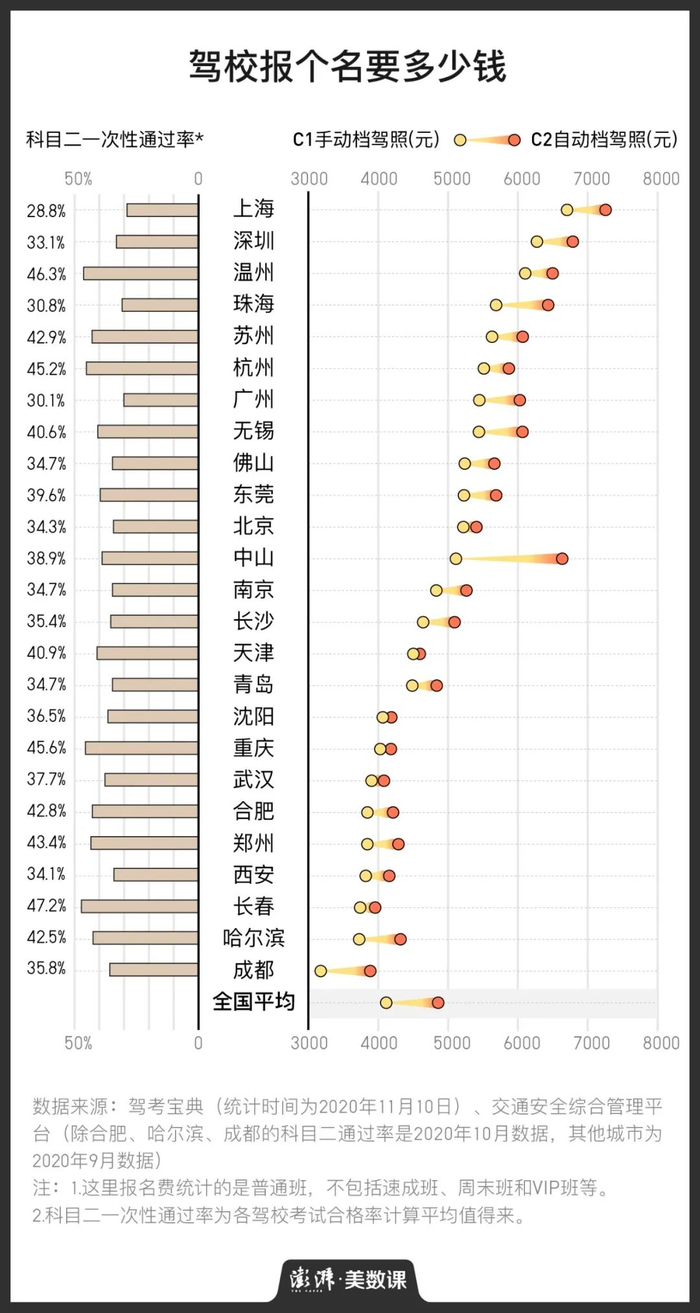 在上海,C2自动挡驾照的报名费平均超过了七千元,另一个一线城市深圳,也是六千多。而东北和中西部的城市,基本在四千元上下。