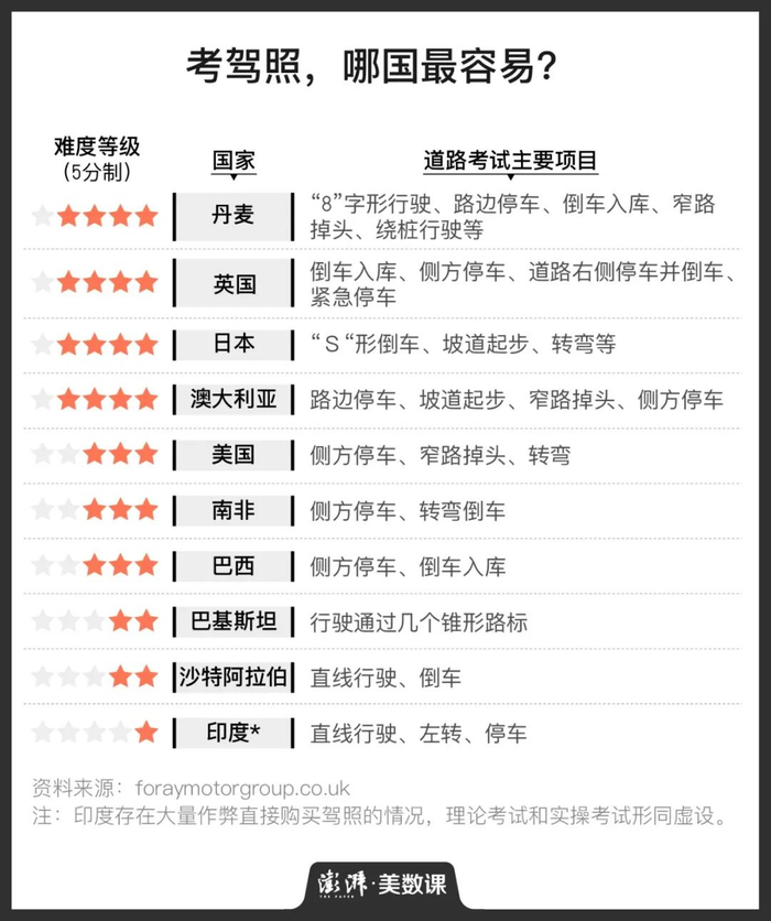 邻国印度和巴基斯坦的驾照路考项目都很简单。在巴基斯坦,路考项目是开车通过几个锥形路标;而印度的考试项目虽然更多,有直行、左拐和停车,但因为作弊买驾照的情况猖獗,获得驾照的难度反而更小。