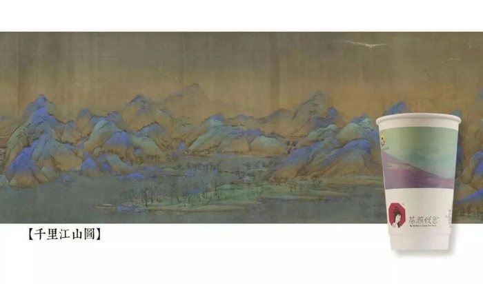 茶颜悦色用《千里江山图》进行创意设计的纸杯 | 图片来源:茶颜悦色公众号