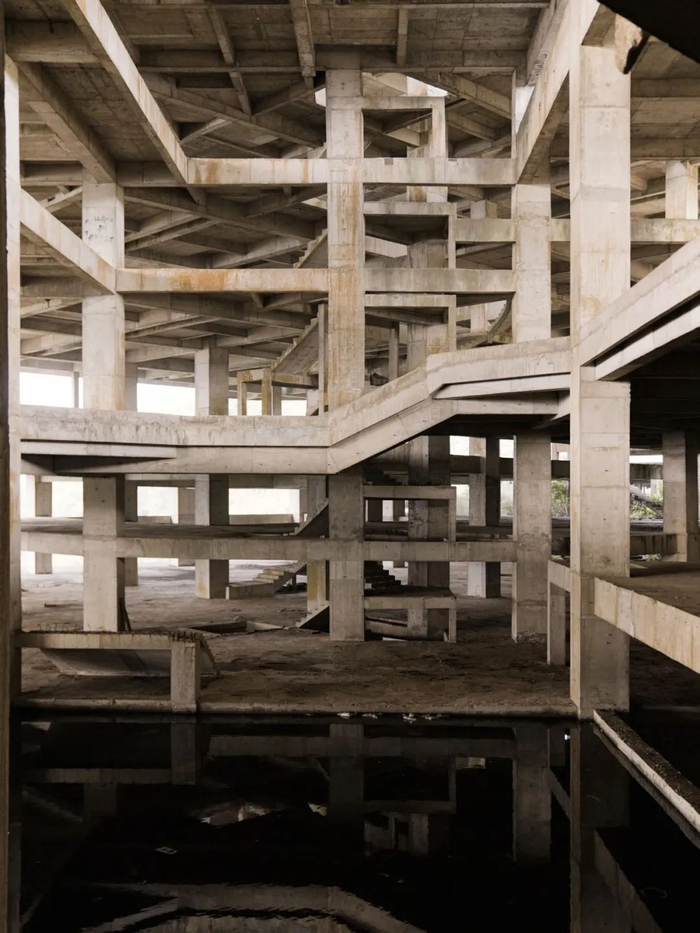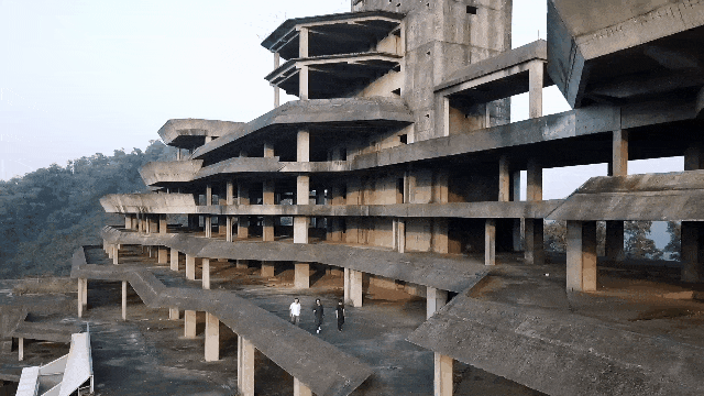 建筑每一层的设计不一样,最上面还有两个停机坪。因为没有完全建完,每一层都有随时能踏空的大缝隙,深不见底的电梯间更是让人毛骨悚然。
