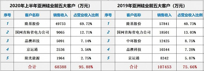 2017年-2019年及2020年上半年亚洲硅业对前五大客户销售金额合计分别为10.30亿元、8.8亿元、10.75亿元和6.84亿元,占当期营业收入的比例分别达60.94%、59.76%、75.66%和 95.88%,整体上呈现持续增长趋势;