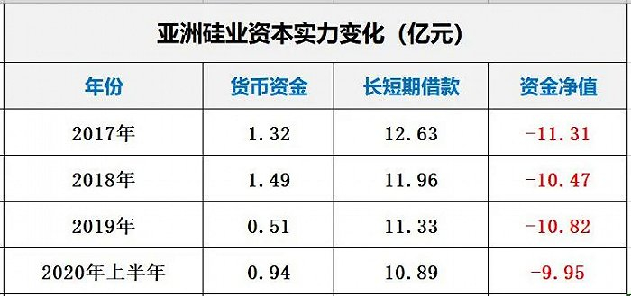 截止2020年6月末,亚洲硅业拥有的货币资金仅为0.94亿元,而长短期有息借款规模达10.89亿元,两者间存在着9.95亿元的资金缺口。