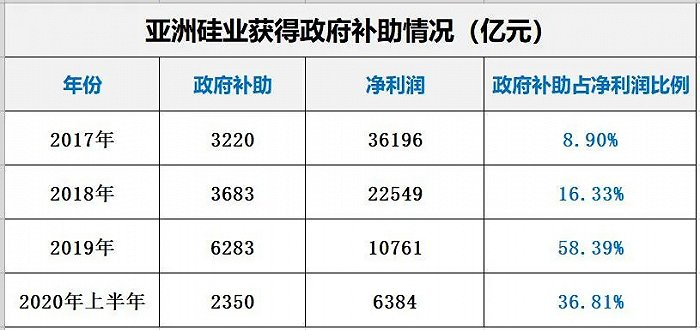 据黑鹰光伏统计,在2017年-2020年上半年间,亚洲硅业获得的政府补助金额都在2000万元以上,2019年获得政府补助6283万元,占净利润的比重达58.39%,2019年亚洲硅业“扣除非常性损益后的净利润”将降至0.47亿元,同比下降了75.82%,降幅将远大于净利润(同比下降52.28%)。