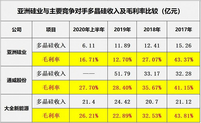亚洲硅业解释,“2018 年、 2019 年,公司多晶硅毛利率显著低于同行业公司,主要因公司多晶硅生产用电价格较高所致。”