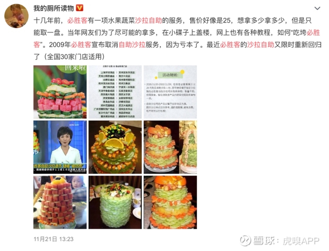 在很长一段时间里,这种水果塔都是必胜客沙拉吧的热门项目,而28元只能拿一次的售卖条件更是加剧了食客们对水果塔的执念。当时,在天涯和贴吧上,如何将水果塔堆到最高甚至成为一个长盛不衰的热门话题。
