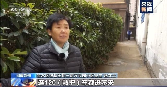 金水区银基王朝三期万和园小区业主 赵女士:4号楼有一个老人,六七十岁了,摔到腰了,连120(救护)车都进不来,最后弄到地下室抬着 还有1号楼有户人家生孩子,羊水都破了,进不来车,最后从地下室,从地下室下去,抬着,抬到外边,进不来车嘛。