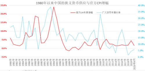 中国改革开放之后,一直到1990年代中期,因为货币超发是经常性的现象,所以每当货币发行过量之后,随后不久就是一轮严重的通货膨胀,即便是从官方统计数字来看,中国物价上涨也一直非常严重,CPI年化增长率超过6%是正常现象,10%、20%也并不罕见。