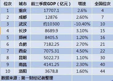 其中,前三季度,重庆、成都和武汉三个城市GDP超过万亿元大关,长沙和郑州超过了8000亿元,合肥和西安处于7000亿元梯队。