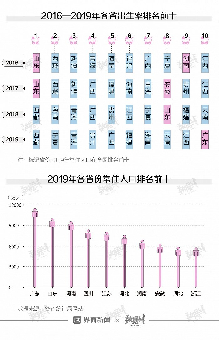 从各省情况来看,除山东省在2016年、2017年连续两年出生率排名第一以外,其余人口大省出生率近几年均未有突出表现。据界面数据统计,2019年常住人口排名前十的省份中,仅有山东省、湖南省、安徽省、广东省在各省出生率排名中进入前十。