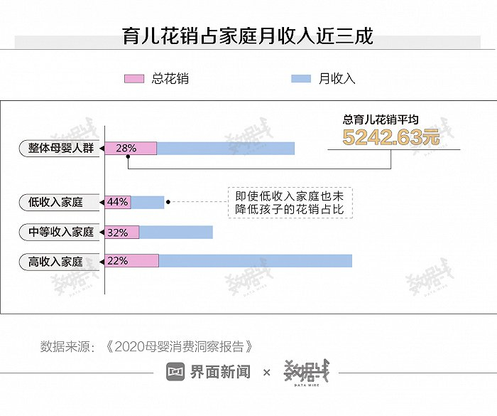报告显示,这些家庭每月育儿花销平均超过5200元,占家庭整体月收入的近三成。而且,低收入家庭的育儿花销占家庭月收入的比例更高,达到44%。