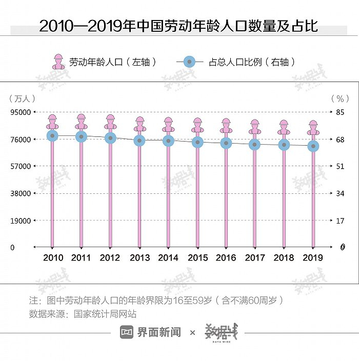 根据界面数据统计,近十年,全国劳动年龄人口数量减少超过4000万人,占总人口比例降幅超过6个百分点。截至2019年底,中国劳动年龄人口数量为8.97亿,连续8年呈下降趋势。