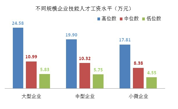 从不同规模企业的技能人才工资中位数看,大型企业为10.99万元,中型企业为10.32万元,小微企业为8.38万元。