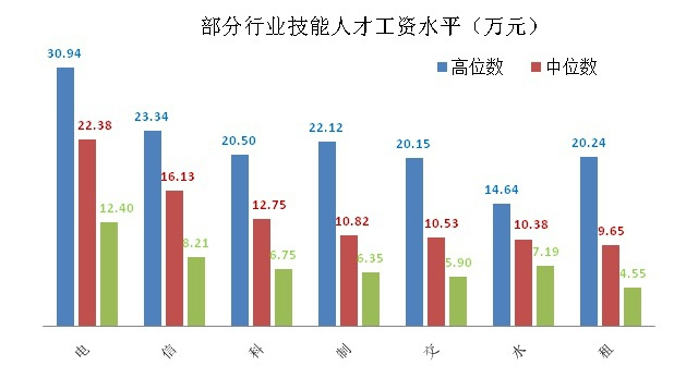 从各行业技能人才工资水平看,电力热力燃气及水生产和供应业、信息传输软件和信息技术服务业、科学研究和技术服务业较高,工资中位数分别为22.38万元、16.13万元和12.75万元,比全部技能人才工资中位数(10.53万元)高11.85万元、5.60万元和2.22万元。