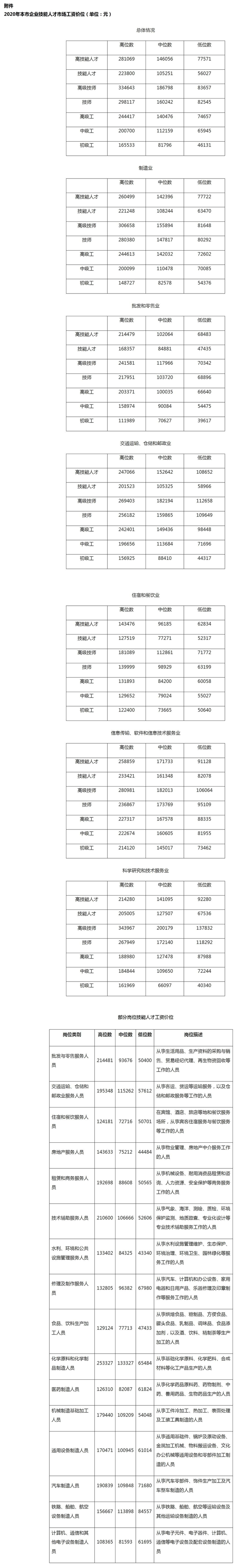 据了解 ,企业技能人才市场工资价位数据来源于国家人社部统一部署开展的企业薪酬调查。今年,本市共调查企业3037户。调查对象为取得国家职业资格证书、在生产服务一线岗位工作、2019年全年正常出勤的技能人才,包括高级技师、技师、高级工、中级工和初级工(其中高级技师、技师和高级工为高技能人才)17.5万人。工资价位数据为2019年取得的全部工资性收入,包括基本工资、绩效奖金、津贴补贴、加班工资等。将每个技能人才的工资水平从高到低排序,处于90%位置的为高位数,50%位置的为中位数,10%位置的为低位数。
