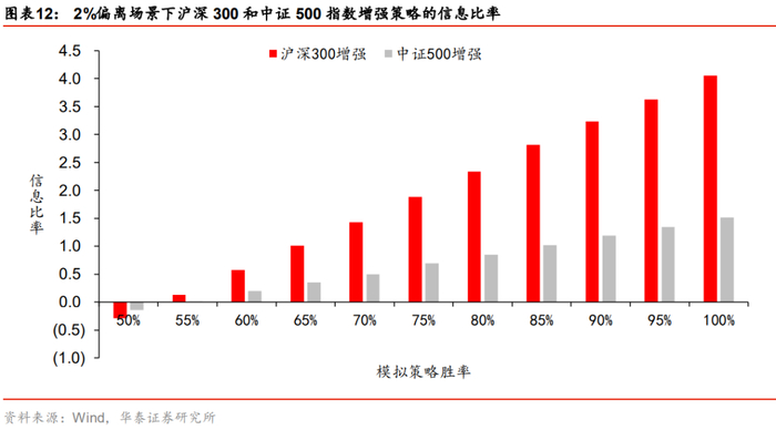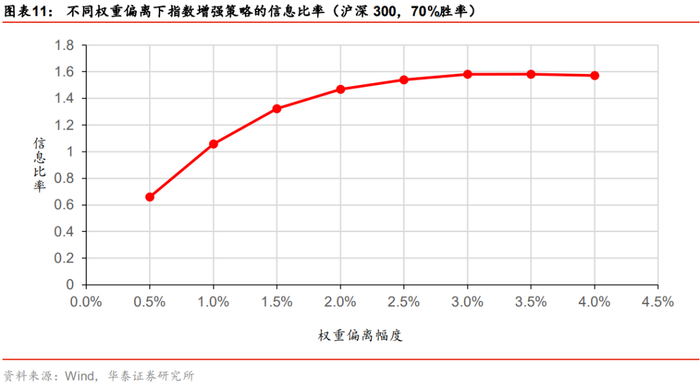 1. 无论是沪深300增强还是中证500增强,在同样的胜率水平下,随着偏离度逐步提升,超额收益表现越好,但边际改善幅度在减弱。以70%胜率为例,偏离1%、2%、3%下沪深300增强策略的信息比率分别为1.03、1.43、1.61;中证500增强策略的信息比率分别为0.32、0.50、0.62;这主要是因为指数内行业权重分布不均,部分行业占比过低,在不能卖空的前提下,做空偏离幅度有限,达到边界值后就钝化了。