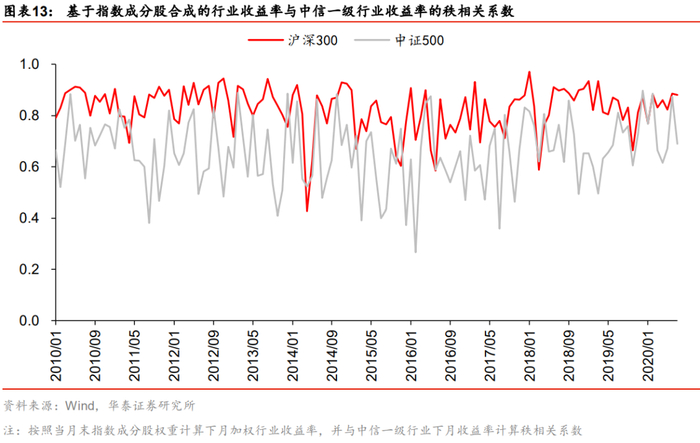 2. 在同样的偏离幅度和胜率水平下,模拟行业轮动策略在沪深300上的增强效果要显著好于中证500。这主要是因为我们在生成模拟行业轮动观点时,依据的是下一期中信一级行业的相对表现,而行业指数的涨跌受大市值个股的影响更明显,因而沪深300内行业的相对表现与中信一级行业的表现关联度更高。为了验证这个推论,我们尝试基于指数成分股加权计算行业涨跌幅,并与中信一级行业同期涨跌幅计算秩相关系数,结果表明沪深300与中信一级行业的相关性显著高于中证500。