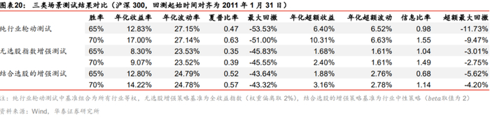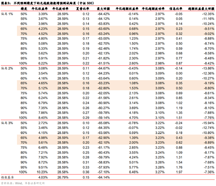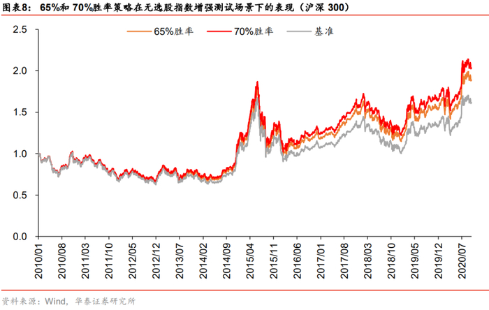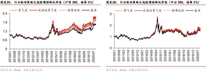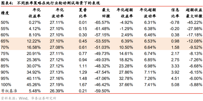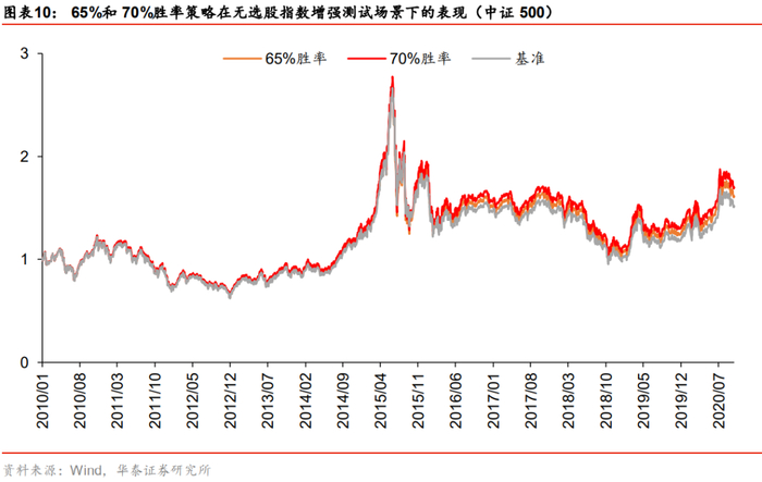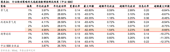 3. 在同样的胜率水平下,无选股指数增强场景下的策略表现要弱于纯行业轮动测试场景。仍以70%胜率为例,纯行业轮动测试场景下,策略相比于行业等权基准的年化超额收益率为10.5%,信息比率1.58;在2%权重偏离场景下,沪深300指数增强策略的年化超额收益率2.28%,信息比率1.43;中证500指数增强策略的年化超额收益率1.53%、0.50。换言之,在纯行业轮动测试场景下表现尚可的策略,直接搬迁到无选股指数增强场景下,超额收益往往会有所下滑。