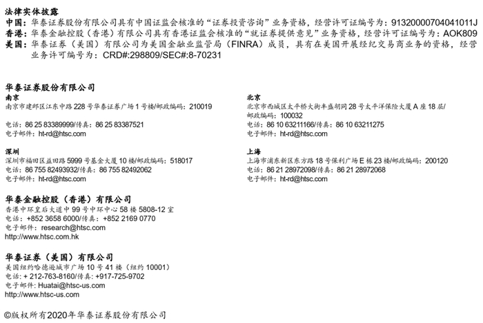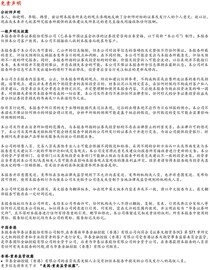 在任何情况下,本公众号中的信息或所表述的意见均不构成对客户私人投资建议。订阅人不应单独依靠本订阅号中的信息而取代自身独立的判断,应自主做出投资决策并自行承担投资风险。普通投资者若使用本资料,有可能会因缺乏解读服务而对内容产生理解上的歧义,进而造成投资损失。对依据或者使用本公众号内容所造成的一切后果,华泰证券及作者均不承担任何法律责任。