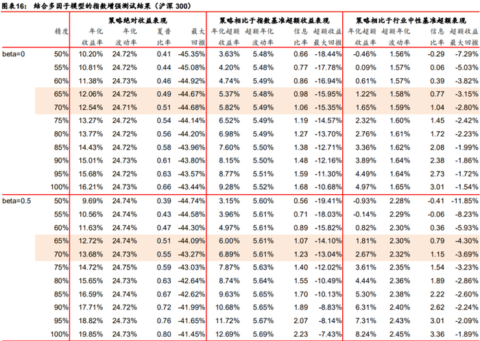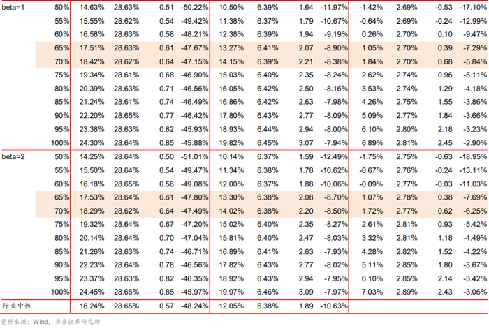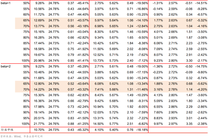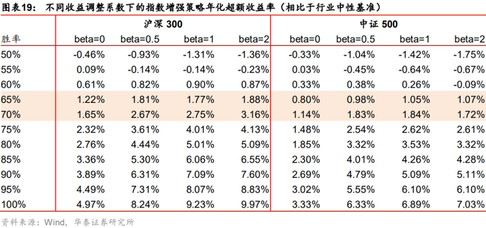 3. 当策略胜率达到一定水平时(65%及以上),收益调整系数的效用才能体现出来,当行业轮动策略胜率偏低时,观点误差较大,此时将轮动观点同时用于行业权重偏离和个股收益调整,会起到误差累积的效果,因而beta > 0时,增强策略的年化超额收益率反而低于beta = 0时;当策略胜率达到较高水平时,预测精准度提升,此时观点的重复利用能够进一步增厚超额收益,以沪深300为例,当胜率达到70%以上时,随着beta变大,超额收益率单调提升,而且随着胜率提升,beta = 2相比于beta = 0的提升幅度不断增厚。