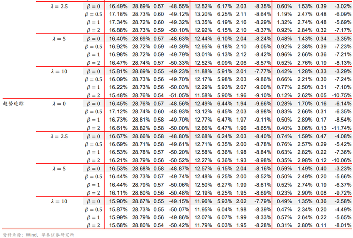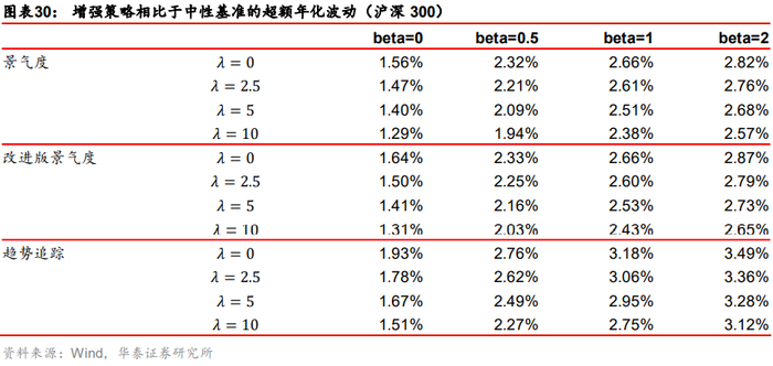 3、 对于两个景气度策略,风险厌恶系数越大,组合相比于中性基准的跟踪误差越小,但年化超额收益也整体更低(当λ > 0时);趋势追踪策略则未呈现出单调的规律。