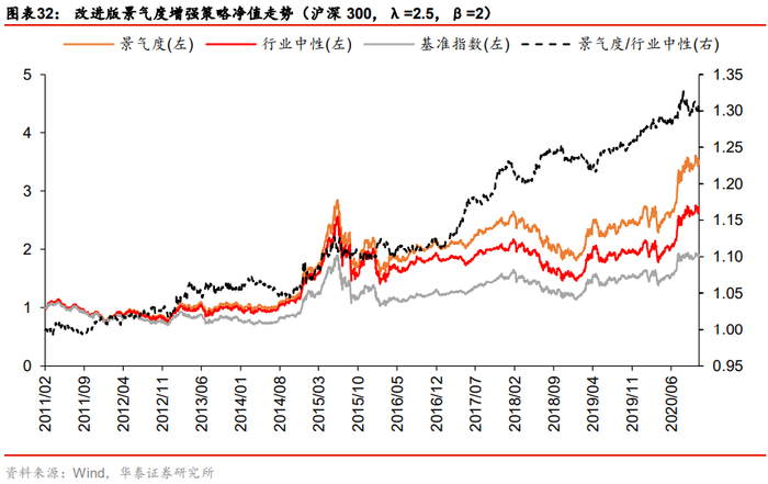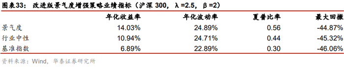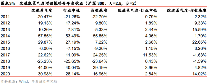上述参数组合中,沪深300增强场景下超额收益最高的策略是λ = 2.5,β = 2时的改进版景气度策略,回测区间内相比于行业中性基准的年化超额收益率3.01%,信息比率1.08;相比于沪深300全收益指数的年化超额收益率为7.05%,信息比率1.26。从分年度收益来看,改进版景气度增强策略相比于行业中性策略每年都有正向超额回报,整体而言,在多因子选股模型的基础上,引入行业轮动进一步增强了策略的表现。