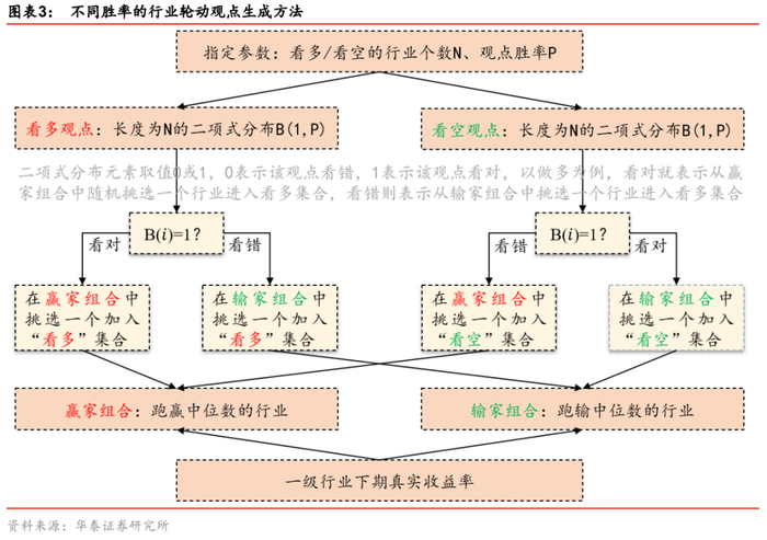 2. 设定参数,包含看多、看空的行业个数 N(本文统一设置为5),以及模拟策略的胜率 P(本文遍历了50%至100%,以5%为步进的11个参数,其中,50%表示完全随机预测,100%表示精准预测)。