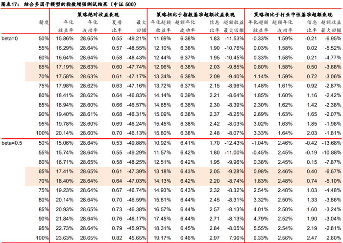 2. 引入行业轮动观点后,相比于行业中性策略,沪深300上的增强效果要显著好于中证500。以70%胜率为例,beta取值0、0.5、1、2下的沪深300增强策略信息比率分别为1.04、1.15、1.04、1.14,中证500增强策略的信息比率分别为0.72、0.74、0.68、0.62;如果以信息比率大于1作为增强有效的标准,那么在沪深300上行业轮动策略胜率达到70%即可,而中证500上则要求胜率达到75%~80%之间。背后原因同样是因为沪深300内行业的相对强弱表现与中信一级行业更相似,而后者是我们生成模拟行业观点的依据。