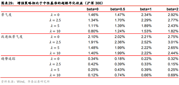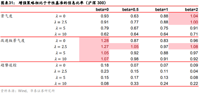 2、 对于两个景气度策略,收益调整系数β越高,增强效果越显著,而趋势追踪策略则不然,说明景气度策略的胜率更高,将其观点同时用于个股收益调整和行业权重偏离能达到双重增强的效果。